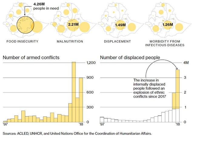 Heightened tensions between the country’s complex patchwork of ethnic groups also threaten the project, pulling at the seams of a nation stitched from the fertile highlands and arid lowlands of a former empire. Abiy is from the country’s largest (but historically subordinate) Oromo ethnic group. His arrival displaced 27 years of ascendancy for Tigrayans, who in turn ended centuries of preeminence for Amharas.
