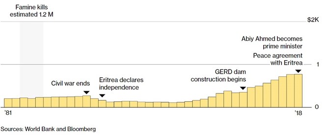 Then there’s the wider effect on the mainly agrarian economy and the region. China has agreed to build a $1.8 billion power grid to support a Chinese-built and funded high speed railway, currently plagued by power cuts, as well as to 16 special industrial zones. Electricity exports to Ethiopia’s neighbors will earn desperately needed hard currency.