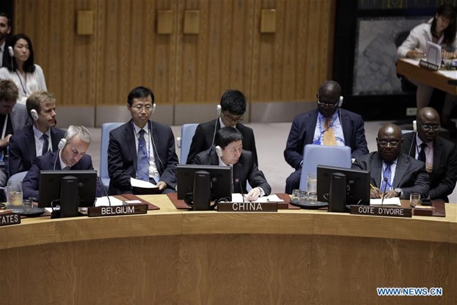 Wu Haitao (C, front), China's deputy permanent representative to the United Nations, addresses a Security Council meeting on the situation in Somalia, at the UN headquarters in New York, Aug. 21, 2019. Wu Haitao on Wednesday said the world should continue to help Somalia strengthen its governance capacity. (Xinhua/Li Muzi)