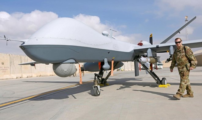 U.S. Air Force officer passes in front of a MQ-9 Reaper drone, one of a squadron that has arrived to step up the fight against the Taliban, at the Kandahar air base, Afghanistan January 23, 2018. REUTERS/Omar Sobhani