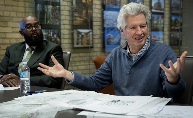 Real estate entrepreneur Diraneh Robleh, left, and Dean Dovolis, CEO of DJR Architecture of Minneapolis, spoke about their public projects in Djibouti.