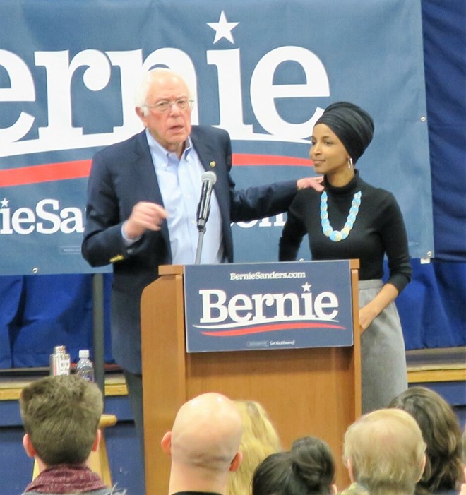 Democratic presidential candidate Bernie Sanders speaks Friday during a New Hampshire rally about his admiration for U.S. Rep. Ilhan Omar, a Minnesota Democrat, who has endorsed him. Steve Collins/Sun Journal