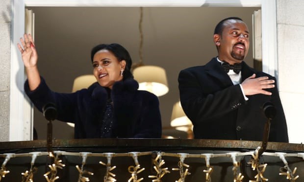 Abiy Ahmed and his wife Zinash Tayachew wave from the balcony of the Grand Hotel in Oslo on 10 December during a torch parade in honour of his Nobel peace prize. Photograph: Terje Pedersen/NTB Scanpix/AFP via Getty Images