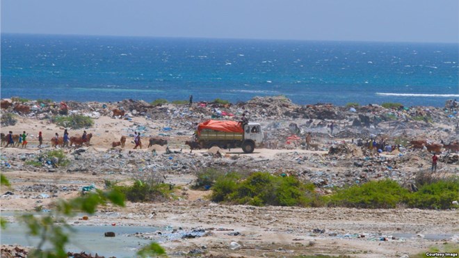 Photos acquired by the VOA Somali Service program Investigative Dossier show the extent of the problem. One picture captures a market worker dumping a wheelbarrow full of discarded fish scraps into the water. Others show huge mounds of cans, bottles, plastic bags, boxes, food waste, scrap metal and other trash strewn across the beaches, with goats and the occasional scavenger picking through the remains.Most ominous of all: photos of smoke rising from the brownish-gray piles as they bake in Somalia's equatorial heat. Winds push the smoke and a foul smell across the city, burning eyes and noses, and endangering the health of Mogadishu residents, as well as the environment.