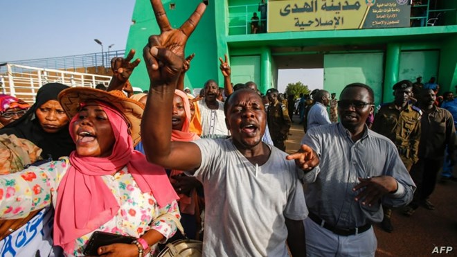 Sudanese people gather outside al-Huda prison in the capital Khartoum's twin city of Omdurman, July 4, 2019, during a ceremony marking the release of 235 members of a faction of the Sudan Liberation Army, which has fought government forces in Darfur.