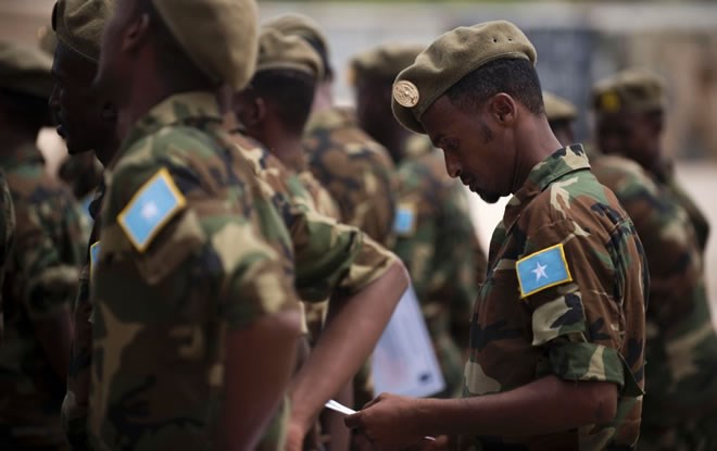 A Somali national army soldier stands in formation after receiving a training certificate after completing 14 weeks of logistical operations training with the U.S. 10th Mountain Division. EVAN PARKER/U.S. NAVY