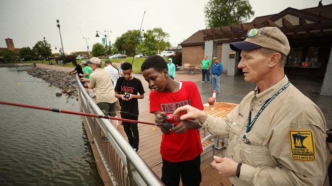 Mark Hauck of the Minnesota Department of Natural Resources helps first-time angler Yusuf Ahmed from St. Cloud use the rod and reel Tuesday at Lake George in St. Cloud, Minn. The DNR and St. Cloud and Stearns County park departments joined the Somali community in an event to celebrate Eid-al-Fitr, which marks the end of Ramadan. Paul Middlestaedt for MPR News