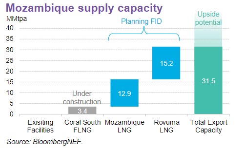 The project will have the capacity to produce 12.9 million tons a year in the first phase, with the scope to expand to as much as 50 million tons. It has contracts with key global importers in Asia and Europe and Mozambique’s location between the Pacific and Atlantic basins is an advantage that will help the country compete with a booming number of LNG suppliers.