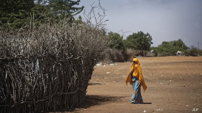 In this Dec. 19, 2017 photo, a Somali girl walks near a fence surrounding a hut at Dadaab refugee camp.