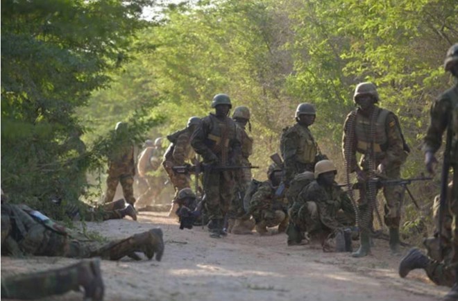 A handout photo released by the African Union-United Nations Information Support team shows Amisom soldiers reacting to gunfire as they are ambushed by Al-Shabaab militants near the town of Qoryooley in Somalia on March 22, 2014. PHOTO | AU UN IST | TOBIN JONES | AFP