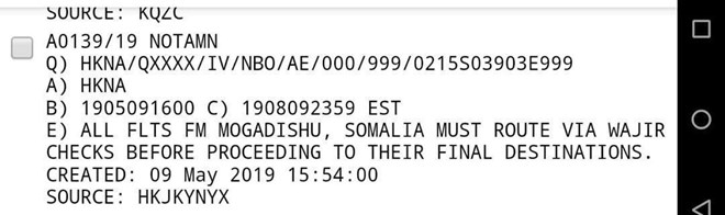 The NOTAM reads: "All flights from Mogadishu, Somalia must route via Wajir for security checks before proceeding to their final destinations".This NOTAM will expire August 9, 2019, unless renewed by KCAA.