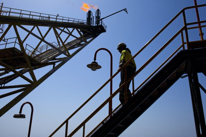 An oil worker passes the waste gas venting pipes on the Casablanca oil platform, operated by Repsol SA, in the Mediterranean Sea off the coast of Tarragona, Spain, June 28, 2016.