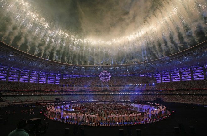 FILE - In this Sunday, June 28, 2015 file photo, fireworks explode above the Baku Olympic stadium in Baku, Azerbaijan, during the closing ceremony of the 2015 European Games. Arsenal says the choice of Azerbaijan capital Baku to host the Europa League final has caused “unacceptable” and “extreme” travel problems for fans. Arsenal and Chelsea have been given just 6,000 tickets each by UEFA for the May 29, 2019 game, in a stadium with a capacity of 68,700. Arsenal says even those tickets may not sell out because of the difficulty of getting to Azerbaijan. (AP Photo/Dmitry Lovetsky, File)