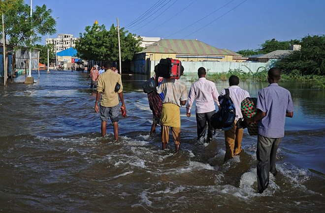 Residents walk through flooded streets in Beledweyne, north of Mogadishu.