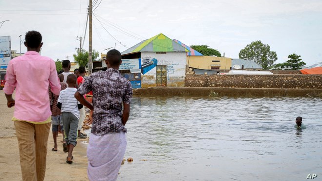 A child swims in the floodwaters as others walk past in the town of Beledweyne, in central Somalia, Nov. 4, 2019. Authorities have not yet said how many people died in Somalia's recent flooding, the country's worst in recent history.