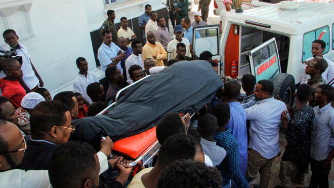 Mourners carry the body of Somali Canadian peace activist Almaas Elman to her funeral service in the capital Mogadishu, Somalia Friday, Nov. 22, 2019. Preliminary investigations show Almaas Elman was killed by a stray bullet inside a heavily defended base near the international airport earlier this week in Mogadishu, the peacekeeping mission in Somalia said Friday. (AP Photo/Farah Abdi Warsameh)