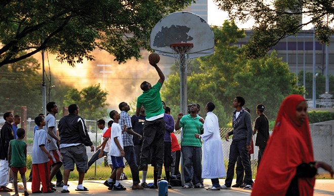 A pickup basketball game near the Cedar-Riverside apartment complex in Minneapolis (Jahi Chikwendiu/The Washington Post/Getty Images)