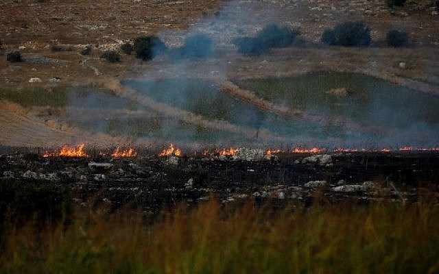 Fires and smoke rising, after the Hezbollah terror group fired anti-tank missiles toward Israel, as seen from a location near the northern moshav of Avivim, close to the border with Lebanon, on September 1, 2019. (Jalaa Marey/AFP)