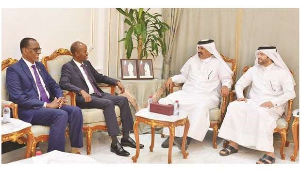Qatar Chamber first vice chairman Mohamed bin Towar al-Kuwari receives Somalia’s Minister of Labour and Social Affairs Sadik Warfa and Somalian ambassador Abdul Razak Farah Ali during a meeting in Doha yesterday.