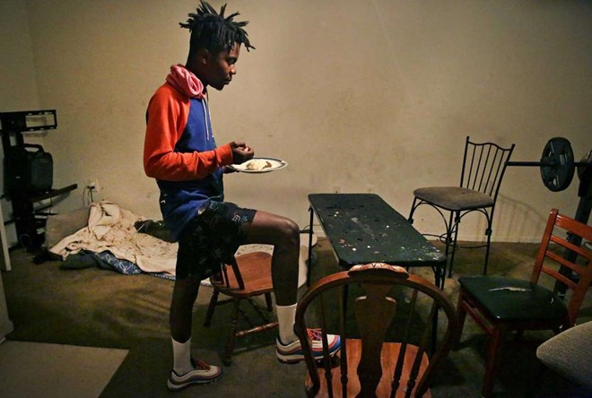 Many of the refugees still cook meals from their home country. Juscar, 19, and his friend Murwanashyaka Mucyuranyana made the traditional African dish fufu with chicken.