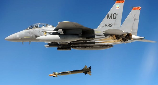 An F-15E Strike Eagle from the 391st Fighter Squadron drops a Guided Bomb Unit-28 during a Combat Hammer mission at Hill Air Force Base, Utah. (U.S. Air Force/Released)