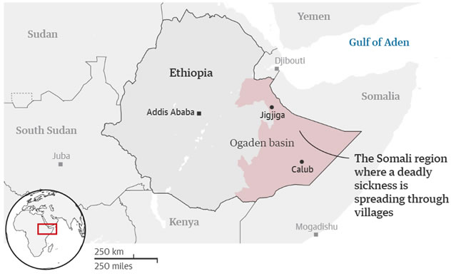 A deadly sickness is spreading through villages near a Chinese natural gas project in Ethiopia’s Somali region, according to locals and officials who spoke to the Guardian. Many of Khadar’s neighbours have suffered the same symptoms. Like him, some died.