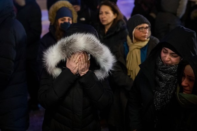 A woman mourns outside the Alberta Legislature Building in Edmonton, Alberta, Wednesday, Jan. 8, 2020, during a vigil for those killed after a Ukrainian passenger jet crashed, killing at least 63 Canadians, just minutes after taking off from Iran's capital. (Codie McLachlan/The Canadian Press via AP)
