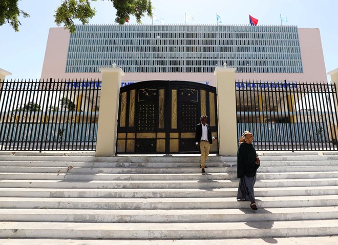 Civilians walk outside a renovated Somalia's National Theatre in Mogadishu. Photo: Reuters