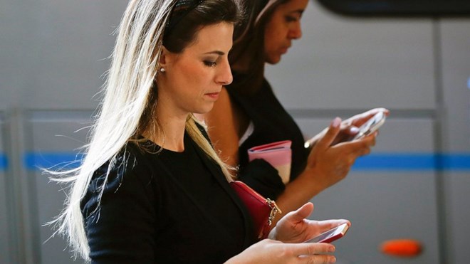 In this May 2, 2016 file photo women check their cell phones as they walk on the sidewalk in Sao Paulo, Brazil. Facebook’s WhatsApp chat platform is launching mobile payments in Brazil, a country often used to test out new services because of its large online population. WhatsApp said in a blog post Monday, June 15, 2020 that users in Brazil will now be able to send money securely, or make a purchase from a local business, without leaving their chat. (AP Photo/Andre Penner, file)