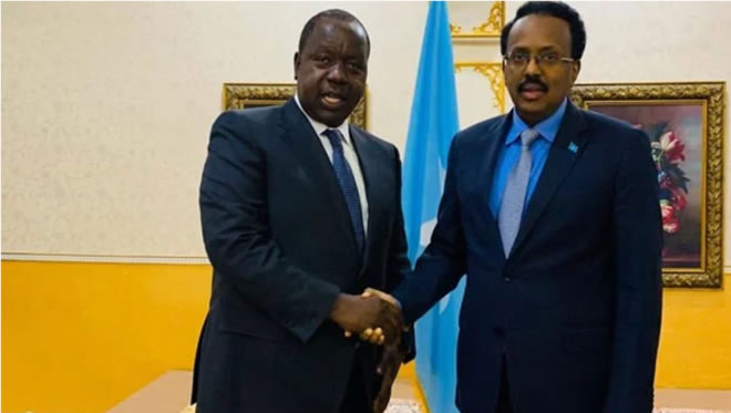 Somali President Mohamed Farmaajo (right), receives a Kenyan Interior Cabinet Secretary Fred Matiang'i in Mogadishu on March 8, 2020. PHOTO | COURTESY