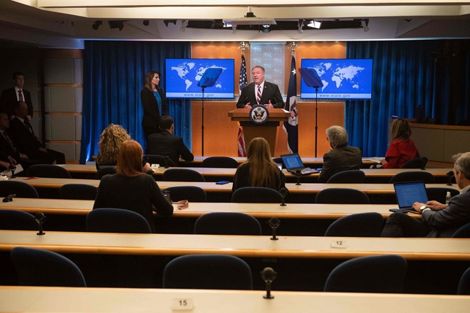 Secretary of State Mike Pompeo spoke at a news conference with limited numbers of journalists because of the coronavirus outbreak on Tuesday.Credit...Nicholas Kamm/Agence France-Presse — Getty Images