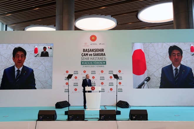 Turkish President Recep Tayyip Erdoğan speaks to Japanese Prime Minister Shinzo Abe in a video call during the opening ceremony of the Başakşehir Pine and Sakura City Hospital, Istanbul, Turkey, May 21, 2020. (AA Photo)