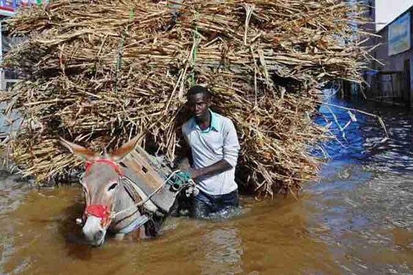 A man manning a donkey cart with dry maize stalks is stuck in the middle of flood waters in downtown Beledweyne, the capital of Hiran region in Hirshabelle State of Somalia, on 15 May 2020. PHOTO ABDULKADIR KHALIF NMG