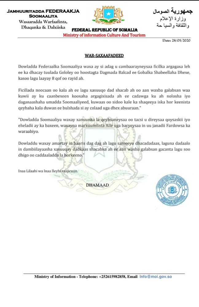 Somalia's Ministry of Information condemned the killing and promised to investigate the murders and hold the perpetrators to account for their crimes.