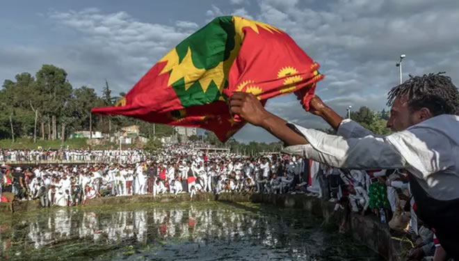 A man waves an Oromo flag during a gathering in Addis Ababa. The attack occurred in Ethiopia’s restive Oromia region. Photograph: Yonas Tadesse/AFP via Getty Images