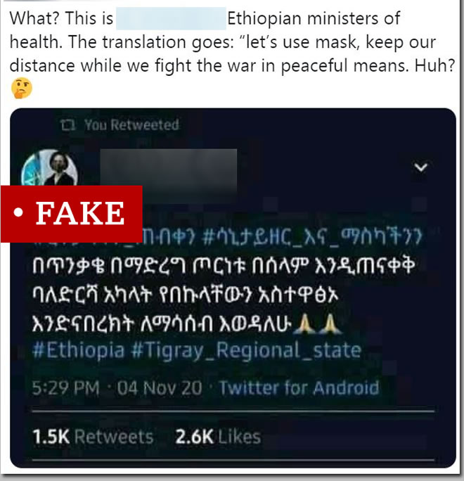 An Ethiopian minister didn't urge soldiers to wear masks