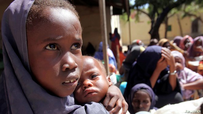 An internally displaced Somali girl carries her sibling as they wait to collect food relief from the World Food Program (WFP) at a settlement in the capital, Mogadishu, in 2011.