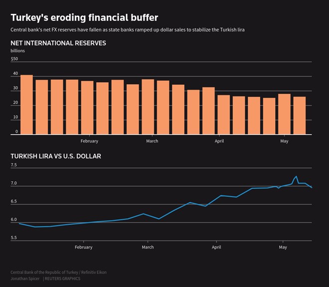 The Turkish central bank's net foreign currency reserves tmsnrt.rs/3bOJYmo have dropped to $26 billion from $40 billion this year. Bankers say that was largely due to state lenders selling some $30 billion in FX markets to support the lira, which has nonetheless fallen 15% this year.