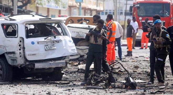 In this file photo, Somali security officers assess the scene of an explosion in Mogadishu on February 13, 2021. (By Reuters)