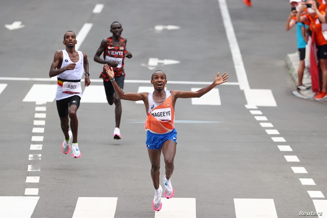 Nageeye said he wanted to sprint for the last 800 meters but held off, waiting for Abdi, until the final 400 meters. Cameras captured Nageeye gesturing toward Abdi to keep up. Nageeye came in second, winning a silver medal with a time of 2:09:58. Abdi came in next, at 2:10:00, earning bronze.