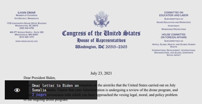 REP. ILHAN OMAR is challenging the Biden administration’s justification for its Tuesday airstrike in Somalia, which the Pentagon claimed was targeted against suspected members of al-Shabab. The Minnesota Democrat is also hitting the White House for a failure to make promised and appropriated reparation payments to families of civilians killed in American airstrikes, according to a letter to President Joe Biden that was provided to The Intercept. The strike was the first in Somalia since Biden took office and came amid the White House’s stated plans, put forward by national security adviser Jake Sullivan in January, to limit drone operations while the administration reviews its counterterrorism policy. Omar, who grew up in Somalia before spending four years in a Kenyan refugee camp, represents a district with a heavy Somali American population.