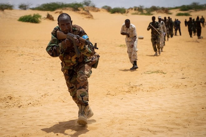 Somali National Army soldiers, some pretending to hold a weapon, take part in a training exercise on March 28, 2013, at the AMISOM Jazeera Training Camp on the outskirts of Mogadishu, Somalia. (Phil Moore/AFP/Getty Images)