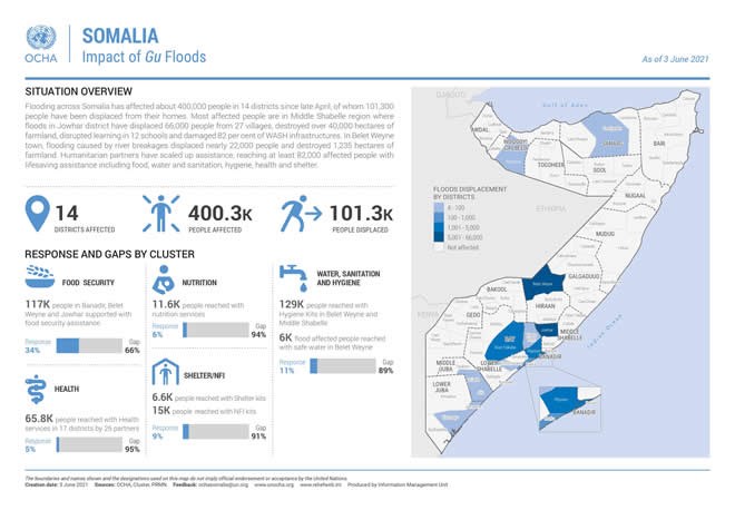 "Most affected people are in the Middle Shabelle region where floods in Jowhar district have displaced 66,000 people from 27 villages, destroyed over 40,000 hectares of farmland, disrupted learning in 11 schools and damaged 82 percent of WASH infrastructures," OCHA said in its floods update, referring to water, sanitation and hygiene facilities.