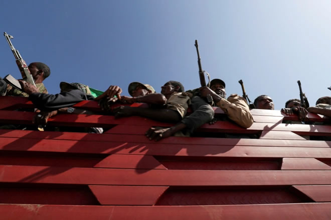 Militia members from Ethiopia's Amhara region head to face the Tigray People's Liberation Front, in Sanja, Amhara region near a border with Tigray [File: Tiksa Negeri/Reuters]