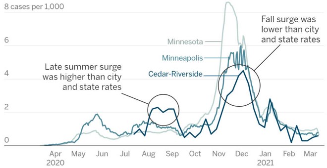 The Cedar-Riverside neighborhood of Minneapolis was an early epicenter of COVID-19 cases and deaths. But since late summer, Cedar-Riverside's ZIP code has usually reported fewer weekly cases per 1,000 people than Minneapolis or Minnesota as a whole.