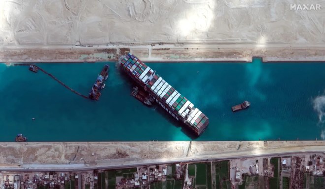 This satellite image from Maxar Technologies shows the cargo ship MV Ever Given stuck in the Suez Canal on Sunday. Two additional tugboats sped Sunday to the area to aid efforts to free the skyscraper-sized container ship, which has been wedged for days across the crucial waterway. (Maxar Technologies/The Associated Press)