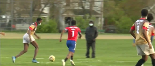 A majority of the people at the soccer match, both on the sidelines and playing in the game, are originally from Somalia.