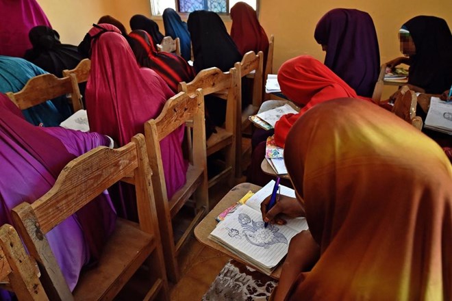 Young women take part in an art lesson at the Elman Peace and Human Rights Centre in Mogadishu on March 24, 2015, where survivors of sexual violence can find refuge, medical care and support. Sexual violence is widespread in Somalia and rarely prosecuted. If anyone is punished at all it is often the victim, not the perpetrator. AFP PHOTO / CARL DE SOUZA (Photo credit: CARL DE SOUZA/AFP via Getty Images) AFP VIA GETTY IMAGES