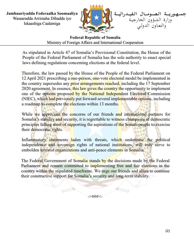 "Inflammatory statements laden with threats, which undermine the political independence and sovereign rights of national institutions, will only serve to embolden terrorist organizations and anti-peace elements in Somalia."