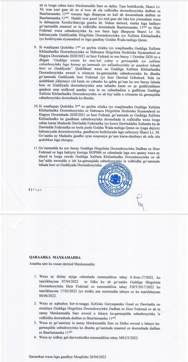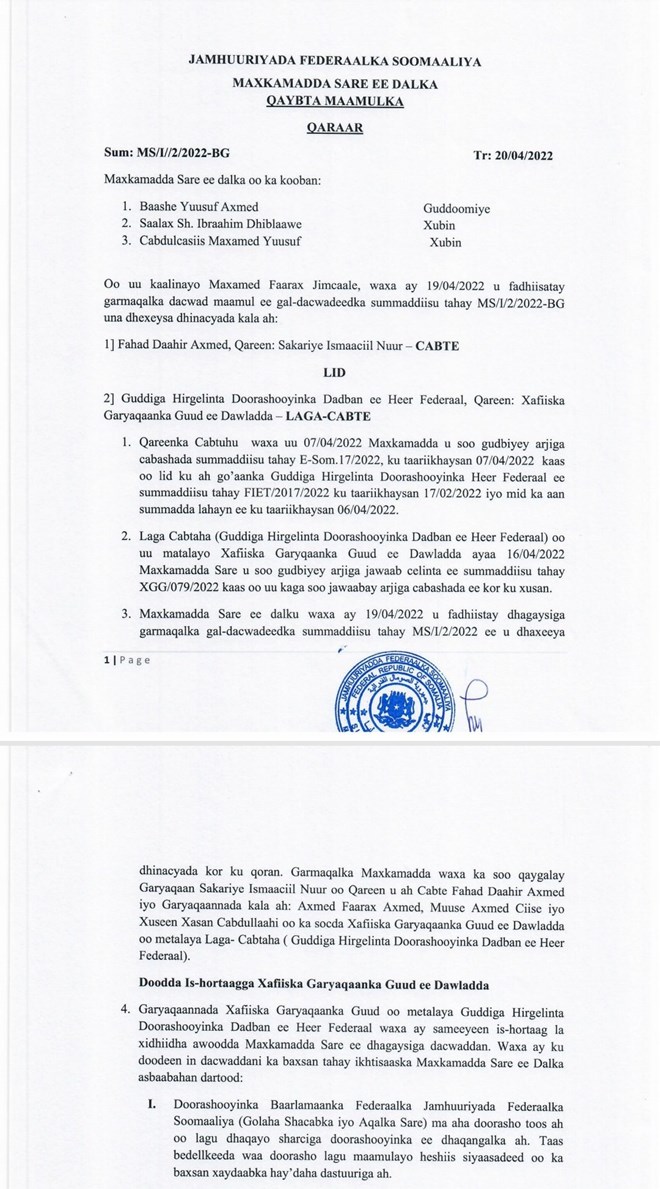 The verdict was signed by the three judges who heard the case: Chief Justice Bashe Yusuf Ahmed, Judge Abdulaziz Mohamed Yusuf, and Judge Salah Sh. Ibrahim Dhiblawe.